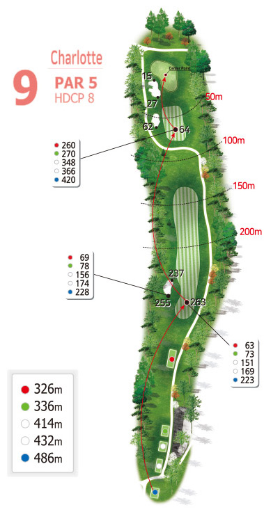내리막 좌도그랙 파5홀로 종종 우측 법면까지 올라가므로 그린우측 끝 방향으로 보내면 중앙에 안착된다. 장타자는 투온을 노려보는 찬스가 있으나 자주 슬라이스성 바람도 불어 핀보다 좌측으로 보내야 성공 확률이 높다.