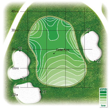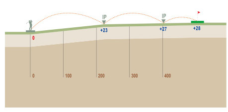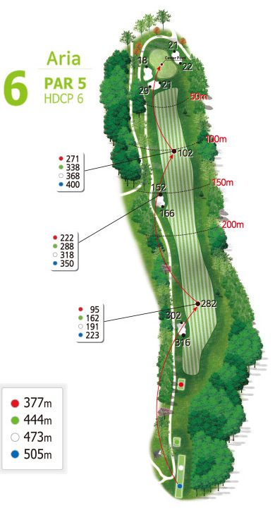 그린까지 길게 쭉 뻗어 있는 가파른 오르막 지형 파5홀로 거리도 상당히 길게 느껴진다. 티샷은 좌측벙커 우측방향이 좋으며 세컨샷 지점부터 그린까지는 완만한 평지이다. 오르막 포대그린으로 다소 여유있는 클럽으로 잡아보자.