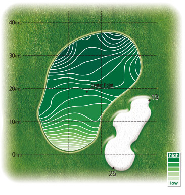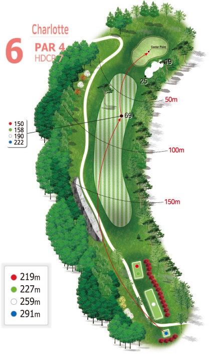 그린이 보이지 않는 우도그랙 오르막 파4홀로 약간만 좌측으로 보내도 법면까지 올라가고 우측은 낭떠러지로 티샷의 방향성에 부담감이 많다. 오르막 포대그린으로 짧으면 우측 커다란 벙커가 도사리고 있다.
